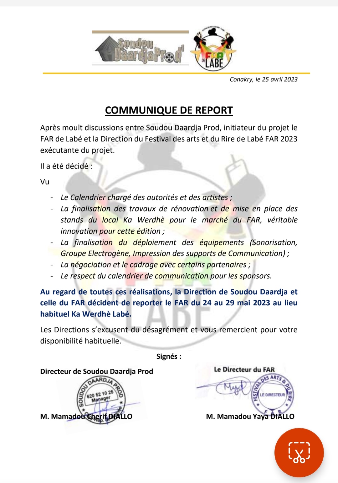 L’édition de cette année du Festival des Arts et du Rire de Labé a été officiellement reportée. Elle se tiendra désormais du 24 au 29 mai 2023.