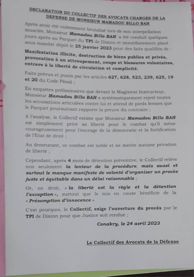 Les avocats du FNDC, dans une déclaration dont copie a été envoyée à la rédaction de Laguinee.info, dénoncent de nouveau, la lenteur que prennent les autorités judiciaires, d’organiser un procès.