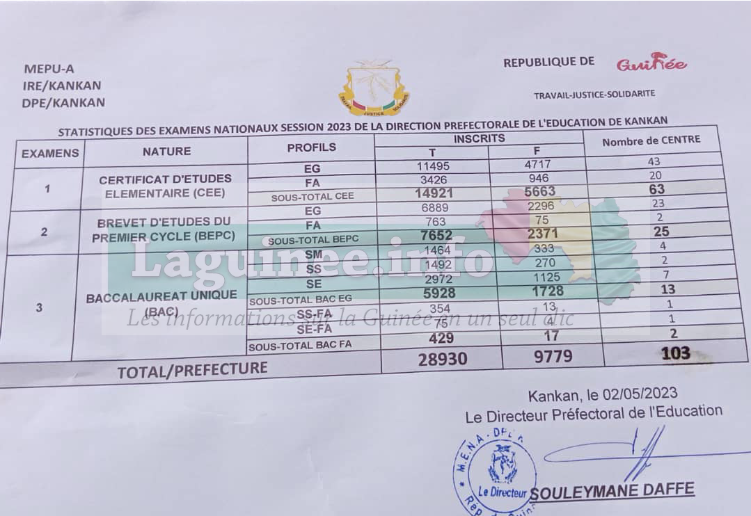 Selon le Directeur préfectoral de l’Éducation de Kankan Souleymane Daffé, les statistiques des examens nationaux session 2023 de la DPE de Kankan sont les suivantes :