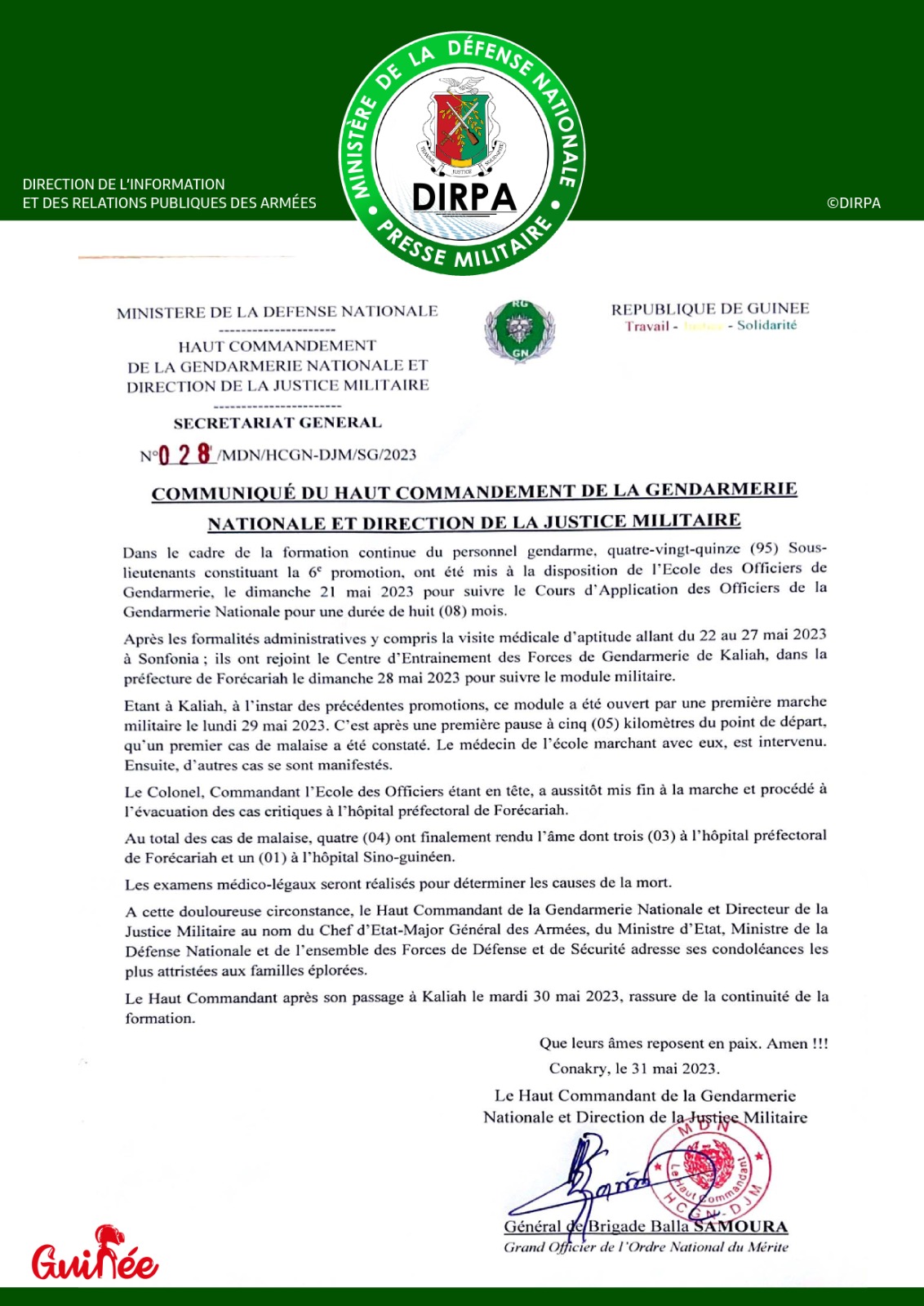 Pour balayer tout doute alors que l’affaire commençait à faire des vagues, le haut commandant de la gendarmerie nationale, le Général de brigade Balla Samoura a, dans un communiqué dont Laguinee.info dispose copie, affirmé qu’il s’agit plutôt des agents qui ont eu des malaises pendant l’entraînement.