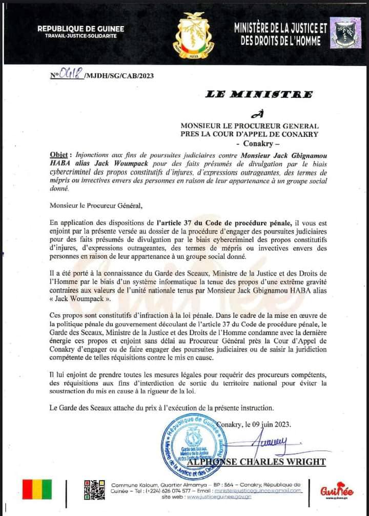 Dans une ordonnance prise hier vendredi 9 juin 2023, dont Laguinee.info dispose copie, le ministre de la justice et des droits de l’homme, Alphonse Charles Wright a instruit le procureur spécial général, d’engager des poursuites Jack Woumpack car, selon lui, les propos tenus par celui-ci sont constitutifs d’infraction à la loi pénale.