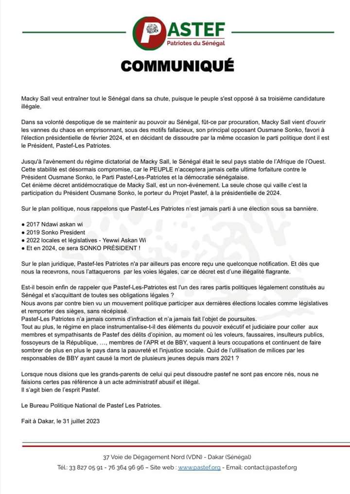 La Direction du parti d’Ousmane Sonko réagit à la dissolution du PASTEF hier lundi 31 juillet 2023 par le ministre de l’intérieur du Sénégal.