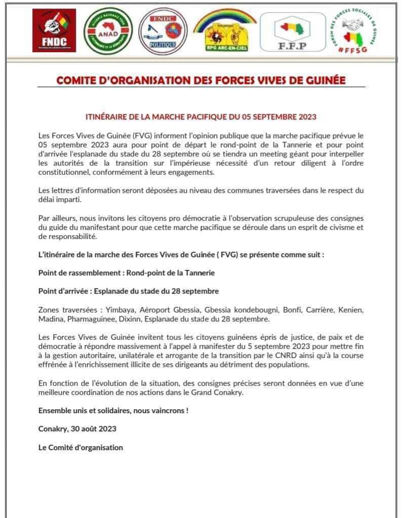 Jusque-là méconnu, l’itinéraire de la marche pacifique du 5 septembre 2023 à l’initiative des Forces Vives de Guinée (FVG) est désormais connu.