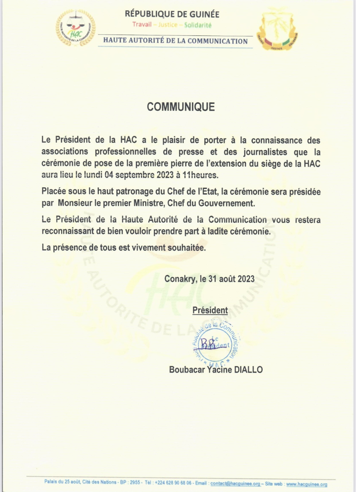 Le Président de la HAC à travers un communiqué transmis à Laguinee.info, informe les associations professionnelles de presse et des journalistes que la cérémonie de pose de la première pierre de l’extension du siège de l’institution aura lieu le lundi 04 septembre 2023, à 11heures.