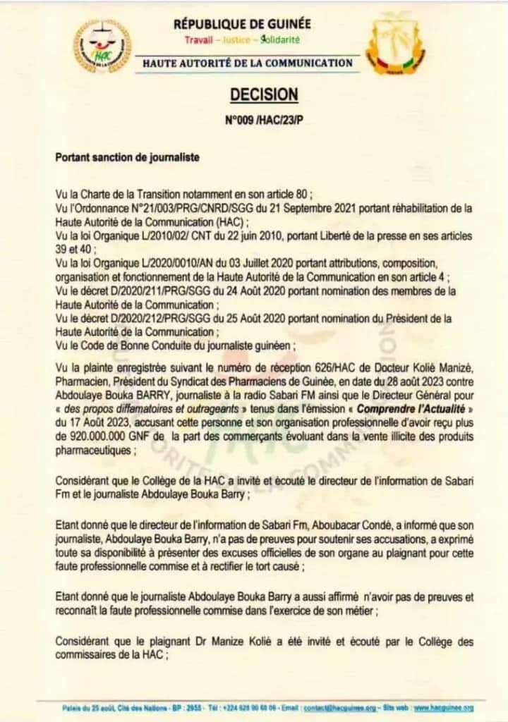 Il s’agit du journaliste Bouka Barry de Sabari Fm. La décision dont Laguinee.info dispose copie, fait suite à une plainte de Dr Manizé Kolié, pour diffamation. Dans sa décision, la HAC rappelle avoir entendu le journaliste et son responsable qui ont, tous les deux, reconnu avoir fait preuve de manquement professionnel.