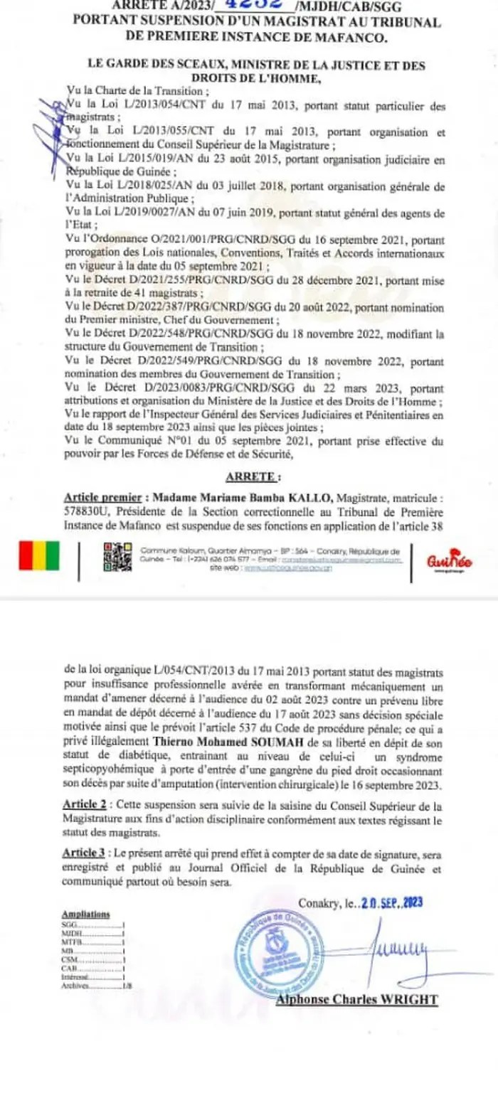 À travers un arrêté dont Laguinee.info dispose copie, le Ministre de la justice et des droits de l’homme, Alphonse Charles Wright a suspendu ce mercrdi 20 septembre 2023, la magistrate Mariame Bamba KALLO, matricule 5788301. Elle est, par ailleurs, présidente de la Section correctionnelle au Tribunal de Première Instance de Mafanco.