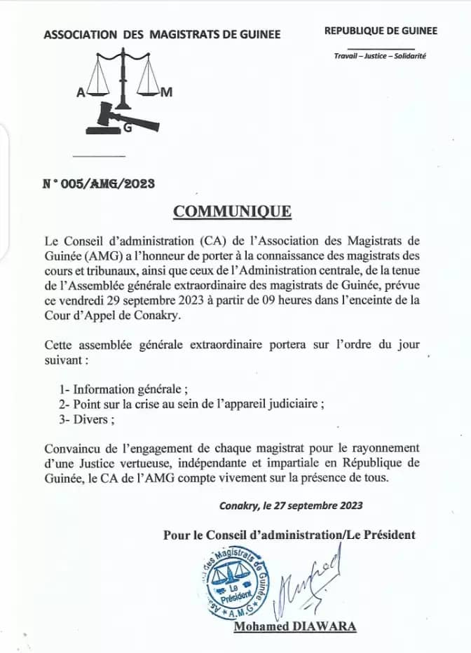 Face à la crise que connaît l’appareil judiciaire, l’Association des Magistrats de Guinée (AMG) à travers un communiqué dont Laguinee.info dispose copie, convoque une assemblée générale ce vendredi 29 septembre 2023 dans l’enceinte de la Cour d’Appel de Conakry.