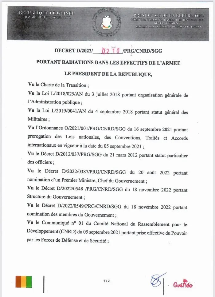 C’est une décision rendue publique ce jeudi 5 octobre 2023, à travers un décret publié sur les médias d’État dont Laguinee.info dispose copie. Le commandant Aly Camara, Matricule 39586/G, Capitaine Abdoulaye 2 Cissé, Matricule 22435/G et le Lieutenant Mamadou Saidou 1 Barry, Matricule 22584/G ont été radiés de l’effectif des forces armées guinéennes, pour des faits d’inconduite.