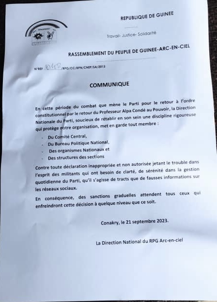 Les responsables du parti d’Alpha Condé déclare : « En cette période du combat que mène le Parti pour le retour à l’ordre constitutionnel par le retour du Professeur Alpa Condé au Pouvoir, la Direction Nationale du Parti, soucieuse de rétablir en son sein une discipline rigoureuse qui protège notre organisation, met en garde tout membre :