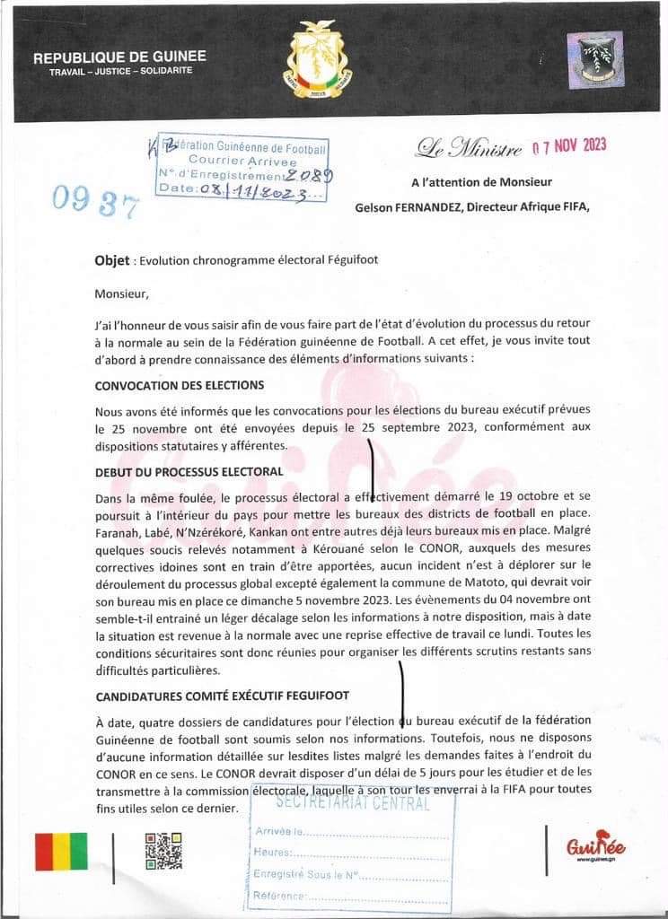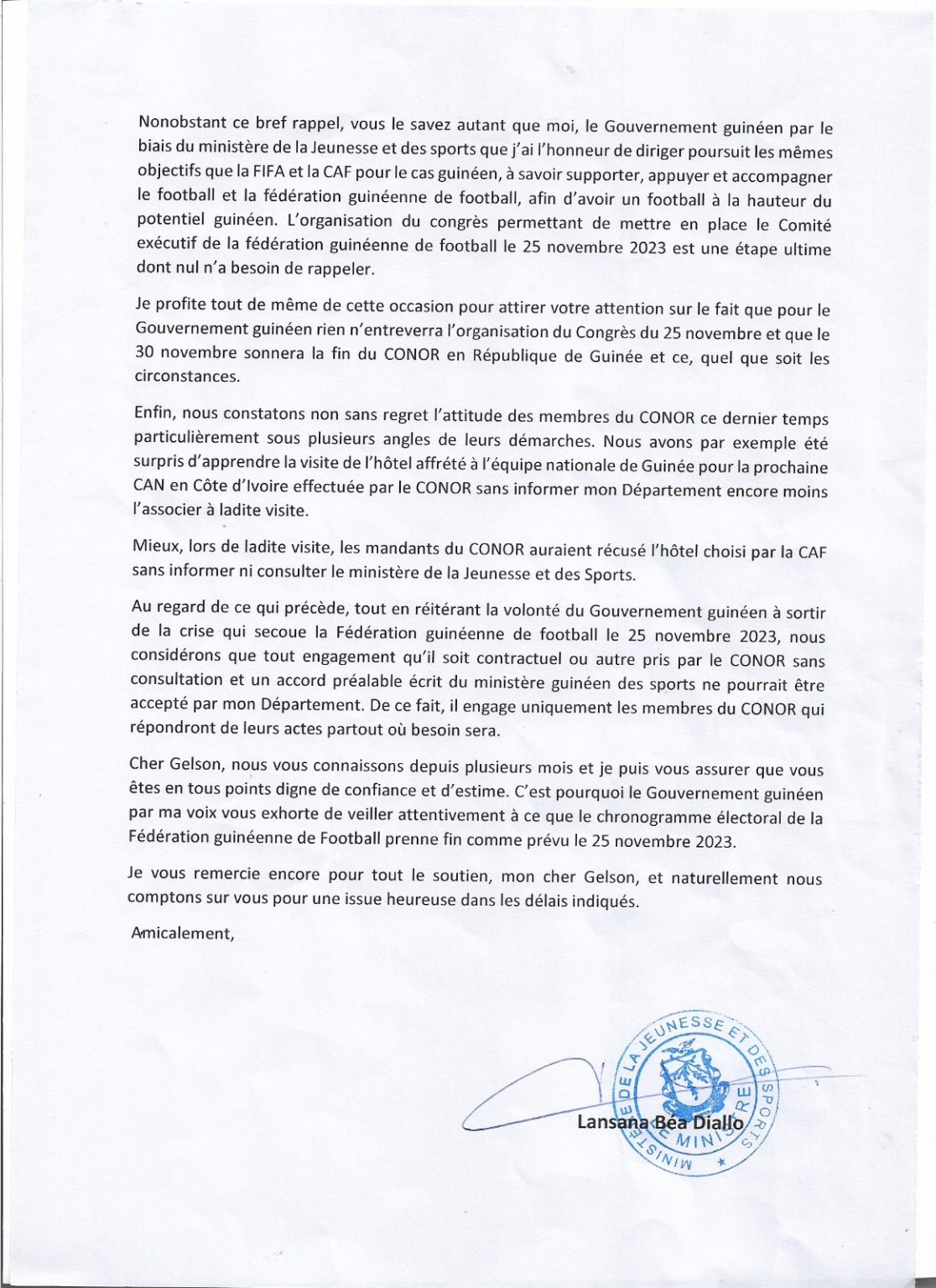 Dans une lettre dont Laguinee.info dispose copie, le ministre de la jeunesse et des sports, Lansana Béa Diallo a regretté un certain nombre d’attitude qu’il met à l’actif du Comité de Normalisation de la fédération guinéenne de football (CONOR-FEGUIFOOT).