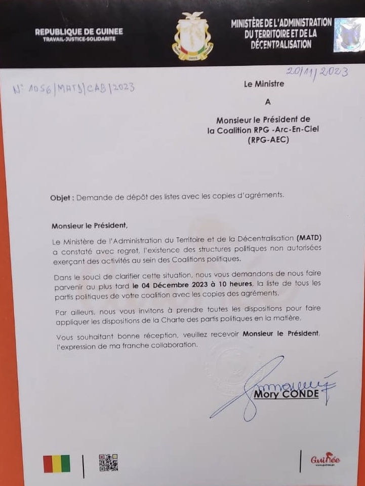 Dans un courrier dont Laguinee.info dispose copie copie, le ministre de l’administration du territoire et de la décentralisation, Mory Condé demande aux coalitions politiques, de lui parvenir au plus tard le 4 décembre 2023, la liste des partis politiques membres de leurs différentes coalitions avec les copies des agréments.