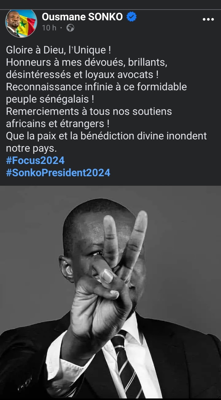 Peu de temps après l’annonce de cette décision judiciaire capitale, Ousmane Sonko a exprimé sa gratitude sur les réseaux sociaux. Sur sa page Facebook, il a partagé sa joie en postant : « Gloire à Dieu, l’Unique ! Honneurs à mes dévoués, brillants, désintéressés et loyaux avocats ! Reconnaissance infinie à ce formidable peuple sénégalais ! Remerciements à tous nos soutiens africains et étrangers ! Que la paix et la bénédiction divine inondent notre pays. #Focus2024 #SonkoPresident2024 »