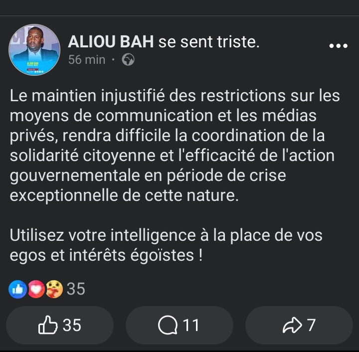 « Le maintien injustifié des restrictions sur les moyens de communication et les médias privés, rendra difficile la coordination de la solidarité citoyenne et l’efficacité de l’action gouvernementale en période de crise exceptionnelle de cette nature. Utilisez votre intelligence à la place de vos egos et intérêts égoïstes ! »