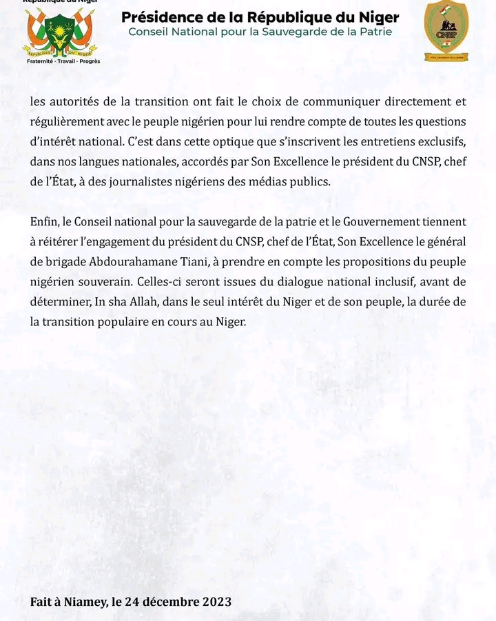 « En tout état de cause, depuis l’avènement du CNSP au pouvoir le 26 juillet 2023, les autorités de la transition ont fait le choix de communiquer directement et régulièrement avec le peuple nigérien pour lui rendre compte de toutes les questions d’intérêt national. C’est dans cette optique que s’inscrivent les entretiens exclusifs, dans nos langues nationales, accordés par Son Excellence le président du CNSP chef de l’État, à des journalistes nigériens des médias publics », rassure le CNSP dans le communiqué.