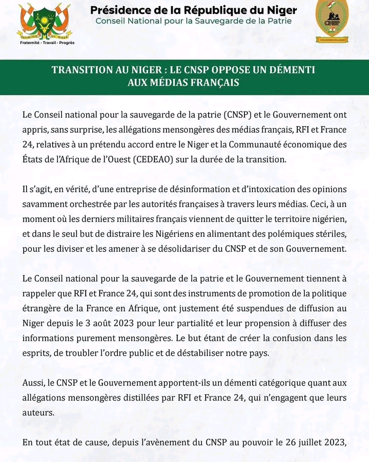 « Le Conseil national pour la sauvegarde de la patrie (CNSP) et le Gouvernement ont appris, sans surprise, les allégations mensongères des médias français, RFI et France 24, relatives à un prétendu accord entre le Niger et la Communauté économique des États de l’Afrique de l’Ouest (CEDEAO) sur la durée de la transition.