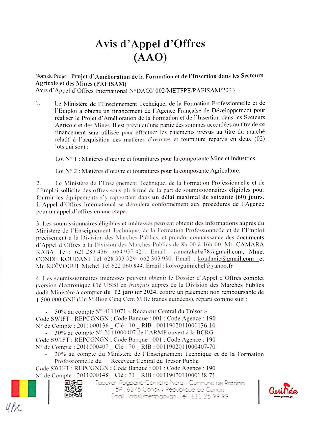 Se connecter Bienvenue ! Connectez-vous à votre compte : votre nom d'utilisateur votre mot de passe Forgot your password? Get help Récupération de mot de passe Récupérer votre mot de passe votre email Un mot de passe vous sera envoyé par email. ActualitéLes annonces Avis d’Appel d’Offres: Fournitures des matières d’œuvre PAFISAM Publié par laguinee.info 30 décembre 2023 Share FacebookTwitterPinterestWhatsAppLinkedinEmailPrintViber À LIRE AUSSI Desserte en courant électrique : le Général Mamadi Doumbouya tape du poing sur la table ! (Confidences) 4 juillet 2024 Filets fatigués, poissons rares: les pêcheurs de Koba dans l’impasse ! 20 avril 2024 Koba: immersion dans l’univers des producteurs artisanaux du sel 19 avril 2024 Le gombo, le trésor vert de la sous-préfecture de Koba ! 18 avril 2024 laguinee.infohttps://laguinee.info Vous êtes intéressé.e par cet avis d’appel d’offre? Cliquez sur ce lien pour toutes les informations. Avis d’Appel d’Offres PAFISAM Share FacebookTwitterPinterestWhatsAppLinkedinEmailPrintViber Article précédentAccidents/Faranah 2023 : La Police routière a enregistré 105 cas d’accidents de la routeArticle suivantDrame à Kaloum: Le RPG arc-en-ciel demande des comptes au CNRD - Advertisement - ECHO DE NOS RÉGIONS Retour de mission mouvementé : frayeur pour Elhadj Fodé Madjaye Magassouba après un accident à Tapiyoka 23 février 2026 Kindia : un incendie ravage plusieurs hectares d’ananas, un exploitant agricole lance un appel à l’aide 22 février 2026 N’Zérékoré : une famille dévastée par un incendie en pleine saison sèche appel au secours 20 février 2026 « Quand je suis arrivé, j’ai entendu des femmes pleurer… il était dans un état vraiment critique » : témoignage sur la mort d’un... 19 février 2026 Kissidougou : le sac de ciment atteint 120 000 GNF dans les magasins 19 février 2026