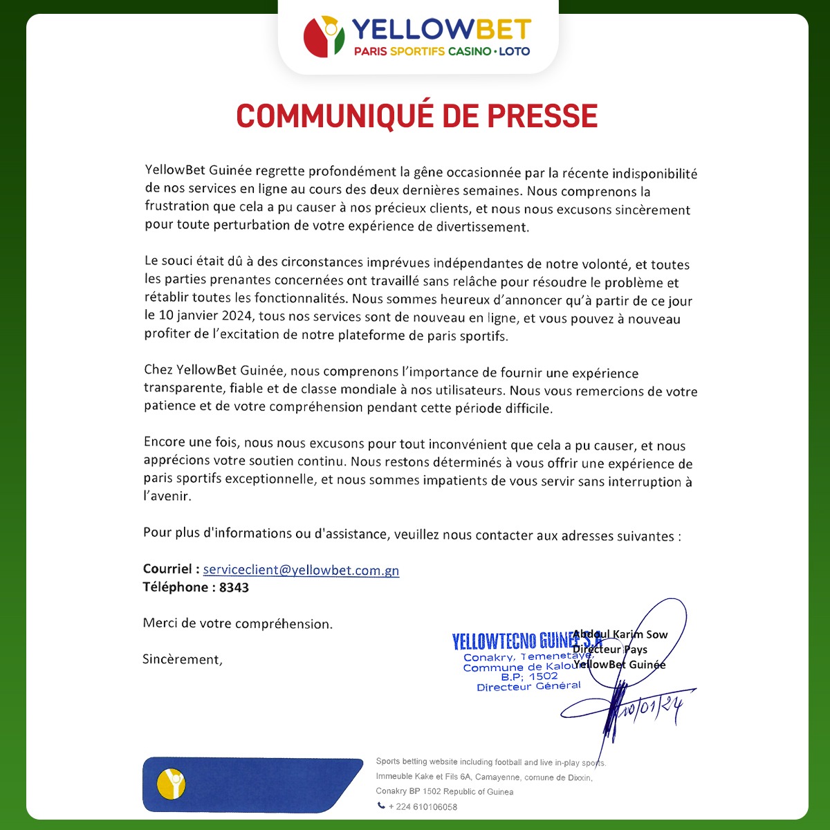 Bonne nouvelle pour les parieurs guinéens! Après quelques jours de suspension par les autorités, la société de jeu Yellowbet vient d’annoncer la reprise de ses activités sur toute l’étendue du territoire national. L’information a été donnée ce 10 janvier 2024 à travers un communiqué dont Laguinee.info vous propose ci-dessous le contenu: