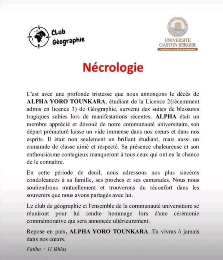 Lors des manifestations sur le campus de l’Université Gaston Berger au Sénégal, le jeune Alpha Yéro Tounkara, étudiant a été tué.