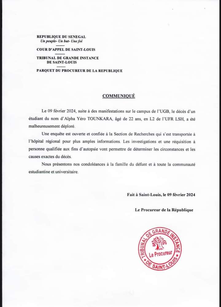 Le Tribunal de Grande Instance de Saint-Louis, dit avoir ouvert une enquête pour trouver l’auteur de ce crime. Il l’a fait savoir à travers un communiqué dont Laguinee.info vous propose ci-dessous le contenu: