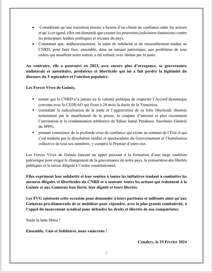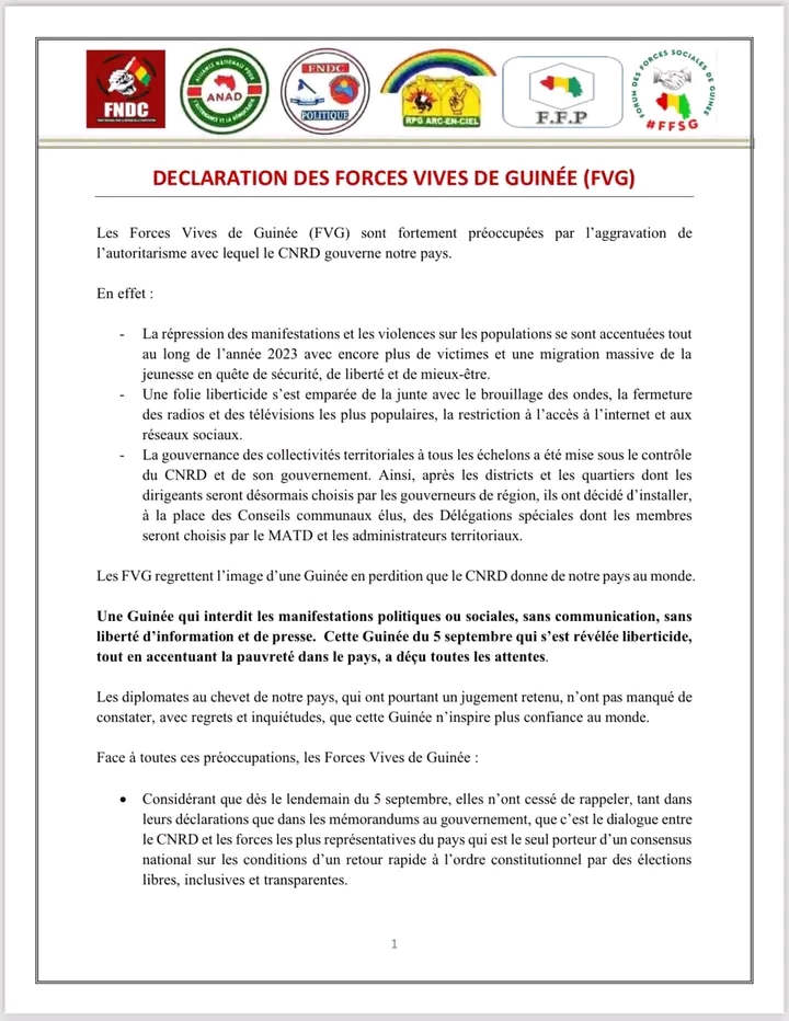 Les Forces Vives de Guinée viennent de faire une déclaration dans laquelle elles dénoncent vivement la conduite de la transition par le CNRD.
