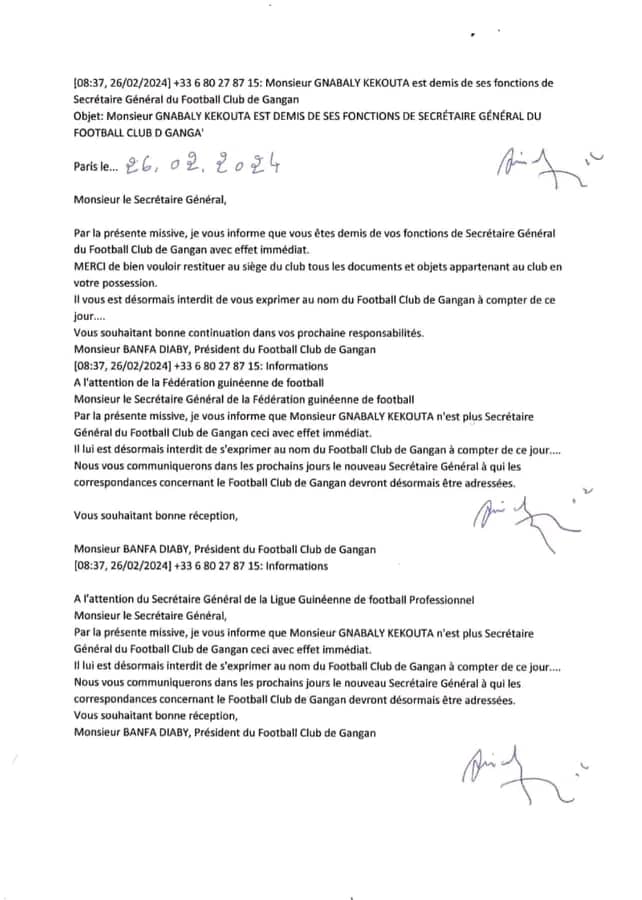 Le Secrétaire général du Gangan FC, Kékouta Gnabaly, a été démis de ses fonctions par le président du club, Banfa Diaby, ce mercredi 28 février 2024. Cette annonce a été faite via un communiqué officiel. Kékouta Gnabaly est prié de restituer tous les documents et objets du club et il lui est interdit de parler au nom de l’équipe. Son remplaçant sera nommé dans les prochains jours. Les raisons de cette décision soudaine n’ont pas été spécifiées.