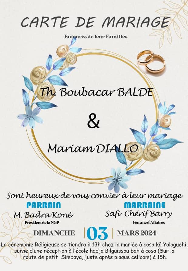 Le couple Baldé vous invite cordialement à participer à cette célébration significative. Vos présences contribueront à rendre ce moment inoubliable pour nos futurs époux.