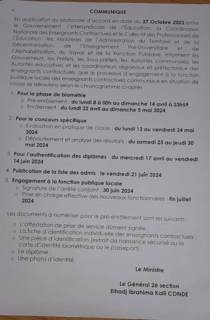 Ce protocole additionnel exprime aussi la volonté du Gouvernement à recruter les enseignants contractuels communaux en situation de classe suivant les différents protocoles d’accord signés le 1 septembre, le 27 octobre et le 15 novembre 2023.