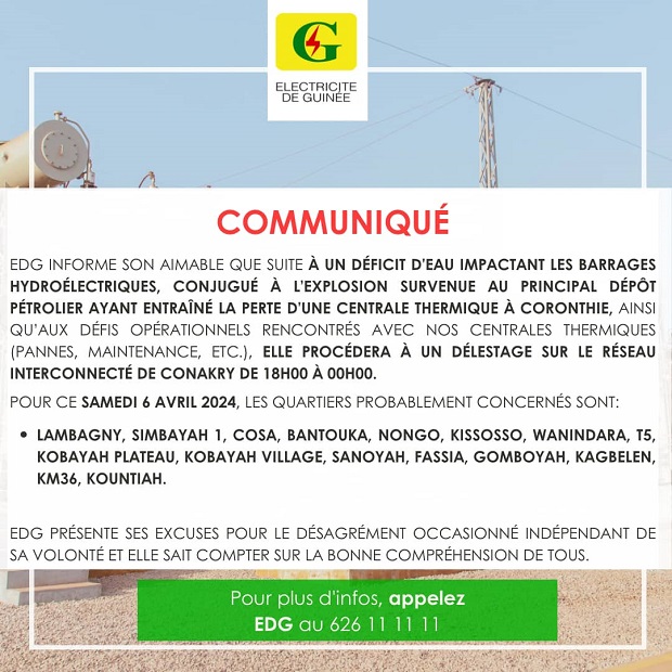 Se connecter Bienvenue ! Connectez-vous à votre compte : votre nom d'utilisateur votre mot de passe Forgot your password? Get help Récupération de mot de passe Récupérer votre mot de passe votre email Un mot de passe vous sera envoyé par email. ActualitéLes annonces Communiqué: EDG annonce la perturbation de la desserte en électricité dans des zones de Conakry Publié par laguinee.info 6 avril 2024 Share FacebookTwitterPinterestWhatsAppLinkedinEmailPrintViber À LIRE AUSSI Desserte en courant électrique : le Général Mamadi Doumbouya tape du poing sur la table ! (Confidences) 4 juillet 2024 Filets fatigués, poissons rares: les pêcheurs de Koba dans l’impasse ! 20 avril 2024 Koba: immersion dans l’univers des producteurs artisanaux du sel 19 avril 2024 Le gombo, le trésor vert de la sous-préfecture de Koba ! 18 avril 2024 laguinee.infohttps://laguinee.info La Direction générale de l’Electricité de Guinée(EDG) annonce la perturbation en desserte de électricité dans des zones de la capitale. C’est à travers un communiqué dont voici le contenu que l’information a été relayée: Share FacebookTwitterPinterestWhatsAppLinkedinEmailPrintViber Article précédentGuinée : 13 centrales syndicales demandent à l’État le respect de ses engagements Article suivantInsécurité à Siguiri : attaque armée contre un orpailleur, plus de 200 millions GNF emportés - Advertisement - ECHO DE NOS RÉGIONS Retour de mission mouvementé : frayeur pour Elhadj Fodé Madjaye Magassouba après un accident à Tapiyoka 23 février 2026 Kindia : un incendie ravage plusieurs hectares d’ananas, un exploitant agricole lance un appel à l’aide 22 février 2026 N’Zérékoré : une famille dévastée par un incendie en pleine saison sèche appel au secours 20 février 2026 « Quand je suis arrivé, j’ai entendu des femmes pleurer… il était dans un état vraiment critique » : témoignage sur la mort d’un... 19 février 2026 Kissidougou : le sac de ciment atteint 120 000 GNF dans les magasins 19 février 2026