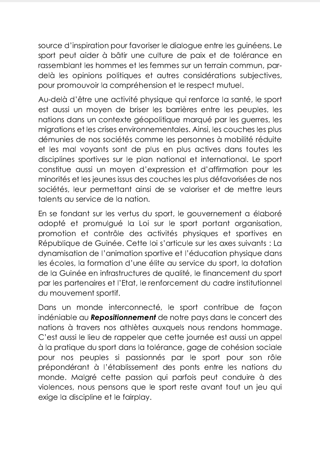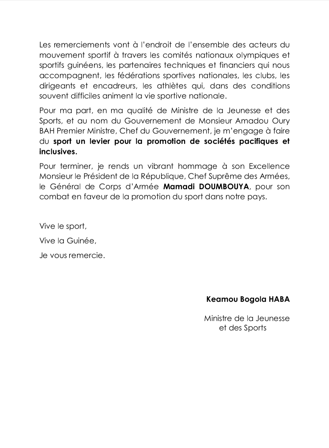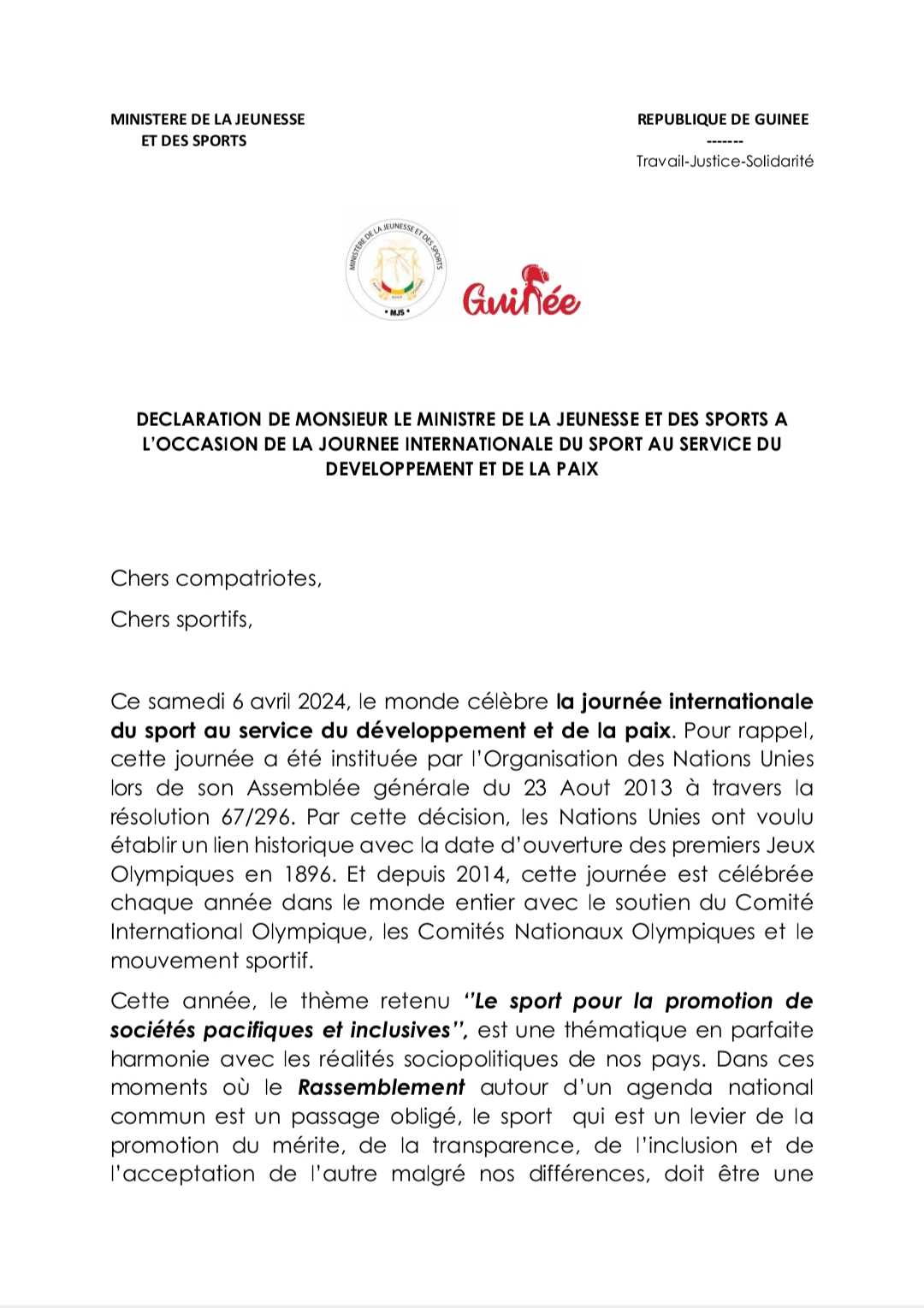 L’humanité a célébré ce samedi, 6 avril 2024, la journée internationale du sport au service du développement et de la paix. A cette occasion, le Ministre guinéen de la Jeunesse et des Sports a fait une déclaration dont Laguinee.info vous propose ci-dessous copie.