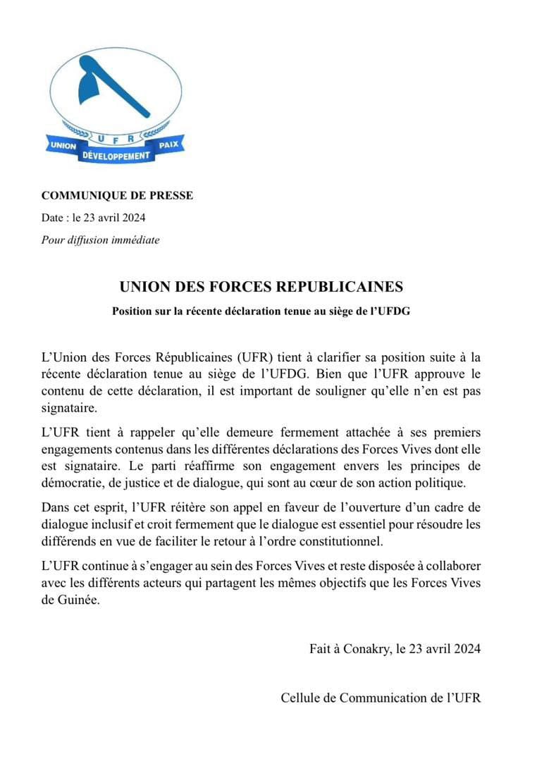 L’UFR, dans sa déclaration, s’aligne sur les positions exprimées par la coalition, tout en soulignant son statut de non-signataire de ladite déclaration.
