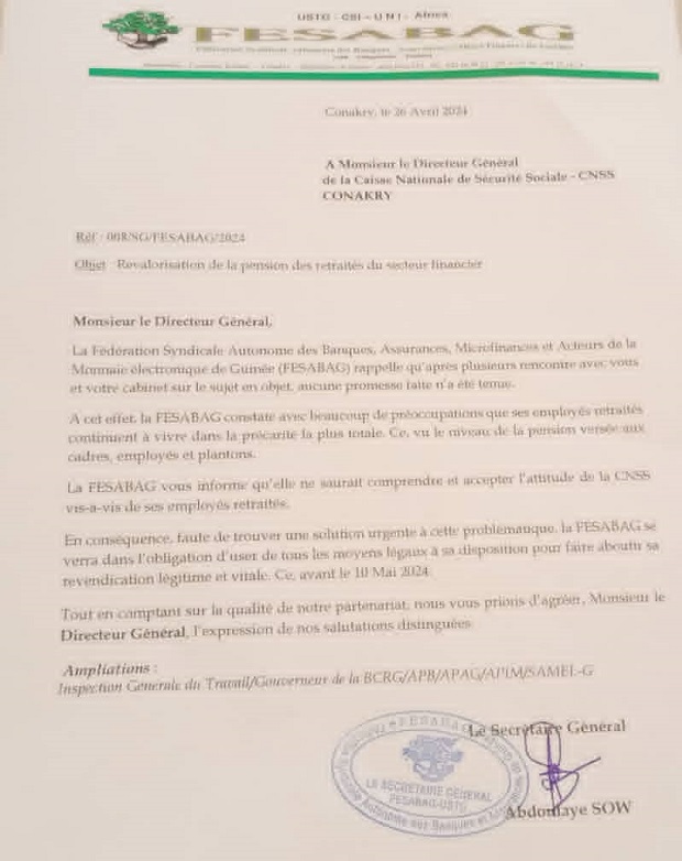 La Fédération Syndicale Autonome des Banques, Assurances, Microfinances et Acteurs de la Monnaie électronique de Guinée (FESABAG), a adressé une note ce mardi 30 avril 2024, à la direction générale de la CNSS (Caisse nationale de sécurité sociale). Dans cette note consultée par une journaliste de Laguinee.info, cette structure syndicale exprime ses regrets face aux conditions de précarité des employés retraités du secteur bancaire en Guinée.