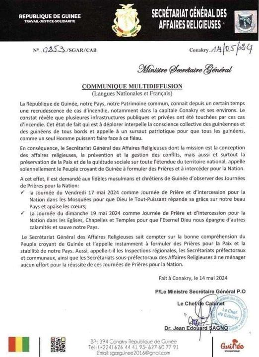 Depuis l’explosion tragique du dépôt d’hydrocarbures de Kaloum, le pays a été frappé par une série d’incendies dévastateurs. Face à cette calamité qui sème le chaos et la désolation, le Secrétariat Général des Affaires Religieuses a lancé un appel pressant à la puissance divine et à la solidarité nationale.