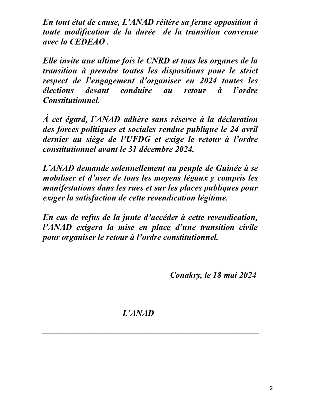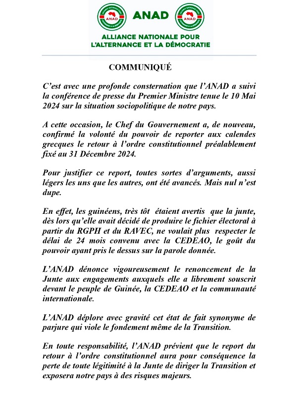 A cet effet, la coalition politique l’Alliance nationale pour l’Alternance et la Démocratie(ANAD), a fait cet énième communiqué pour dénoncer cette « tentative de confiscation du pouvoir » par la junte militaire.