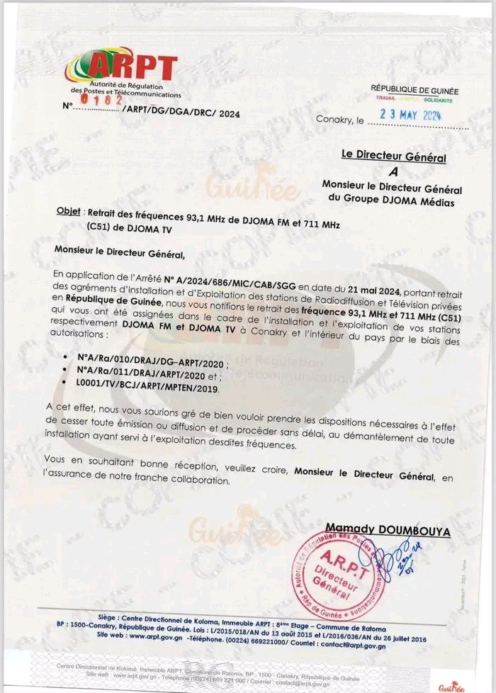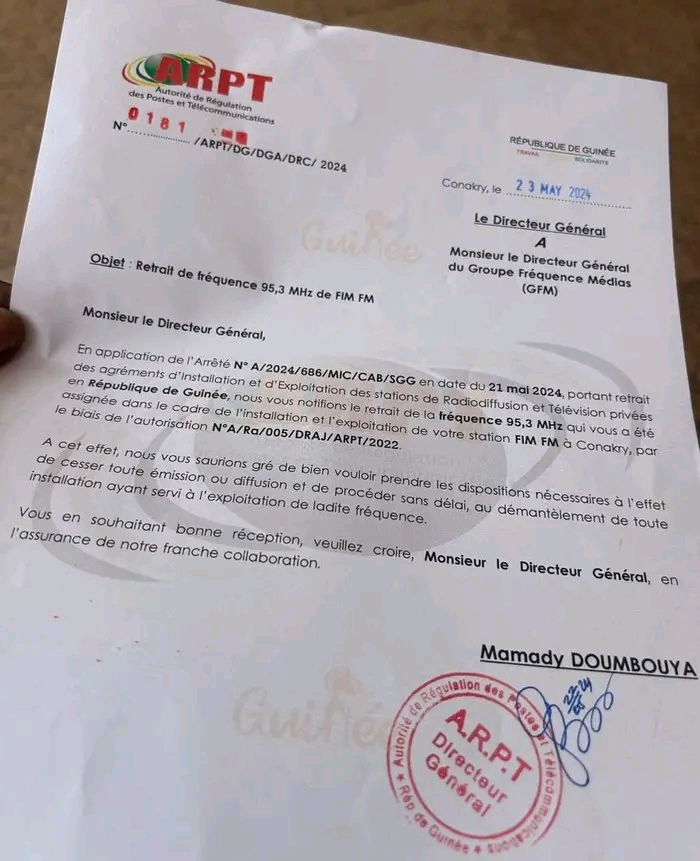 Cette notification a également été faite à Espace FM sont le PDG est Lamine Guirassy.