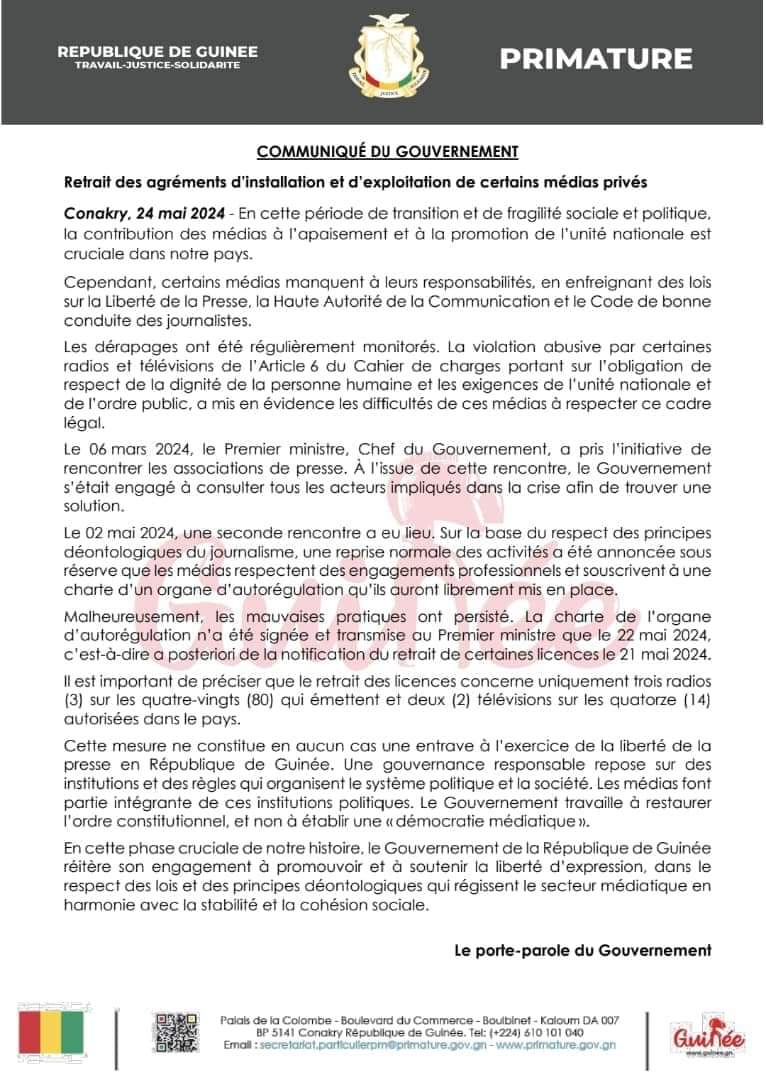 Dans un communiqué publié le 24 mai 2024, le porte-parole du gouvernement, Ousmane Gaoual Diallo, a répondu aux nombreuses réactions et condamnations émanant de la classe politique et de la société civile.
