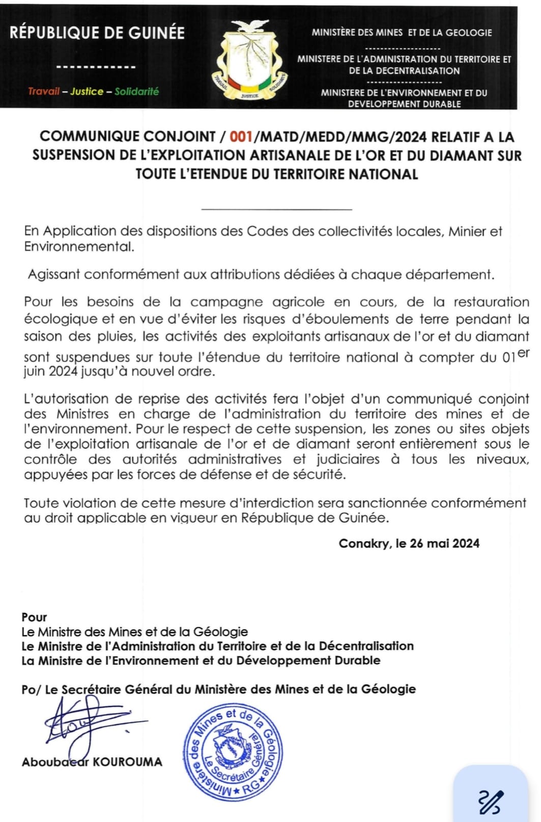 Dans un communiqué diffusé dans la soirée de ce dimanche 26 mai 2024, le ministère des Mines et de la Géologie et celui de l’Administration du Territoire et de la Décentralisation(MATD), ont annoncé la suspension des activités d’exploitation artisanales de l’or et de diamant sur toute l’étendue du territoire à partir du 1er juin prochain jusqu’à nouvel ordre. Les deux départements ministériels justifient cette décision par les « besoins de campagne agricole et de restauration écologique ».