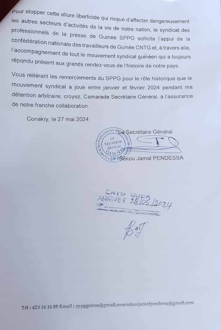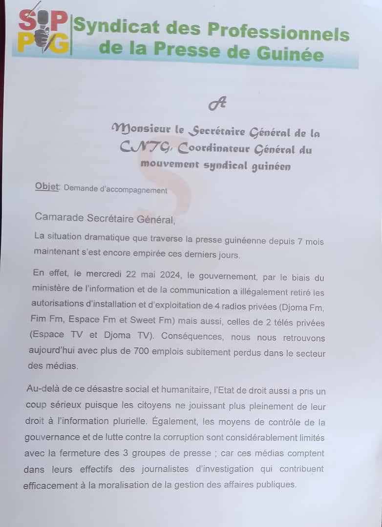 Afin d’amener les autorités de la transition a reconsidérer les décisions drastiques de fermetures des médias privés guinéens, le Syndicat des Professionnels de la Presse de Guinée(SPPG), à travers note adressée au Secrétaire général de la Confédération des Travailleurs de Guinée, sollicité son appui pour la réussite dans cette lutte commune.