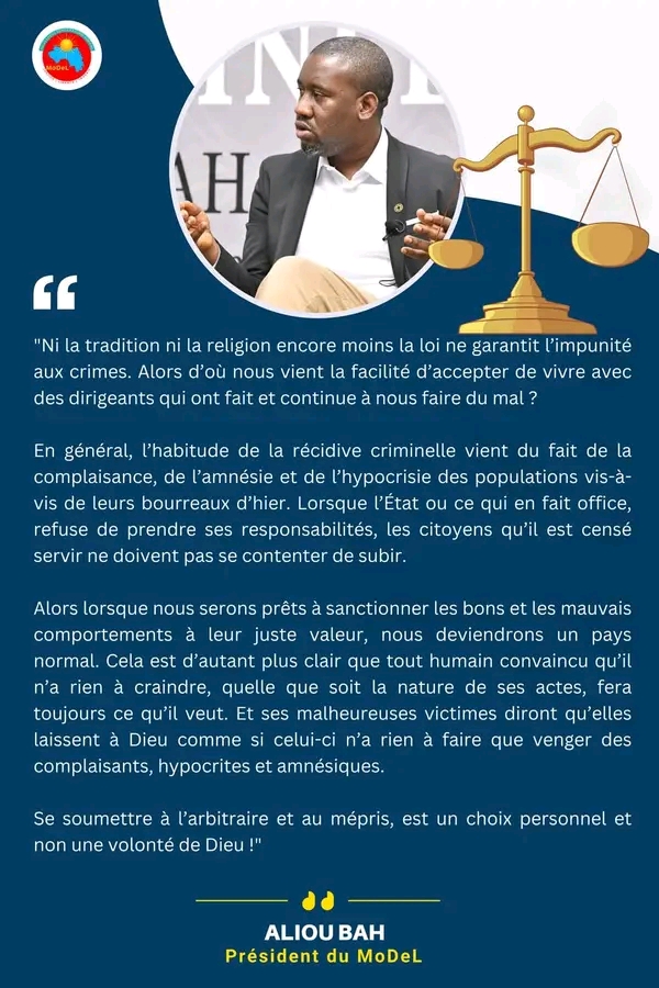“Alors lorsque nous serons prêts à sanctionner les bons et mauvais comportements à leur juste valeur, nous deviendrons un pays normal. Cela est d’autant plus clair que tout humain convaincu qu’il n’a rien à craindre, quelques soit la nature de ses actes fera toujours ce qu’il veut. Et ses malheureuses victimes diront qu’elles laissent à Dieu comme si celui-ci n’a rien à faire que venger des complaisants hypocrites et amnésiques”, regrette Aliou Bah, avant de conclure en ces termes: