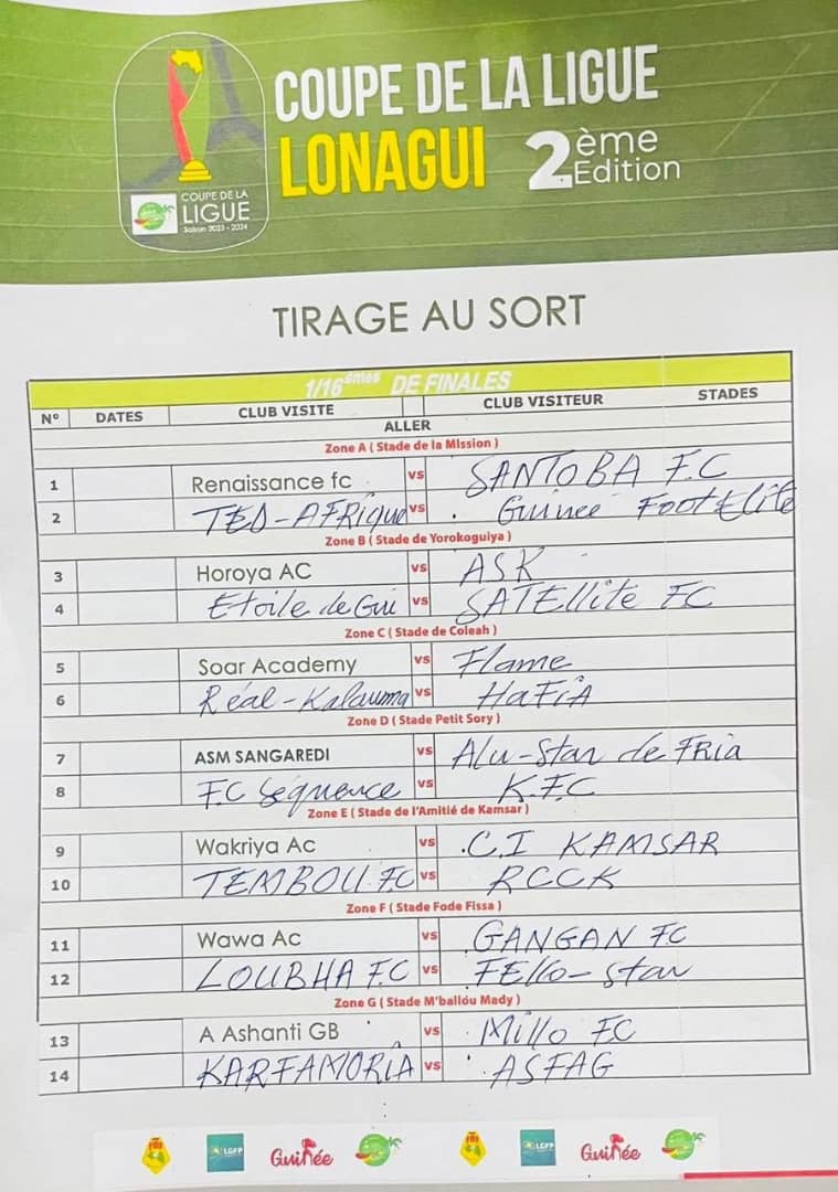 Le tirage au sort des 16es de finale de la Coupe de la Ligue, a été fait ce mercredi à Conakry. Ce tirage révèle des rencontres passionnantes entre les 28 clubs de Ligue 1 et 2 uniquement concernés par cette compétition instaurée l’année dernière par la Ligue Guinéenne de Football Professionnel.