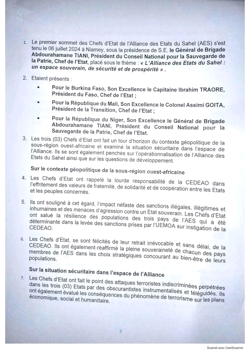Nous, Chefs d’Etat du Burkina Faso, de la République du Mali et de la République du Niger, membres de l’Alliance des Etats du Sahel (AES) ;