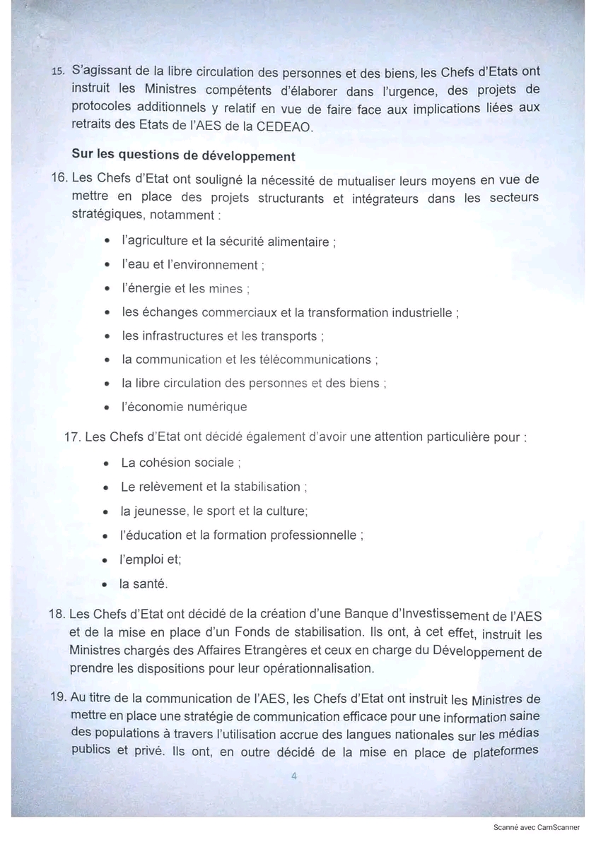 • Avons décidé, solennellement, de la création de la Confédération « Alliance des Etats du Sahel » (AES) ;