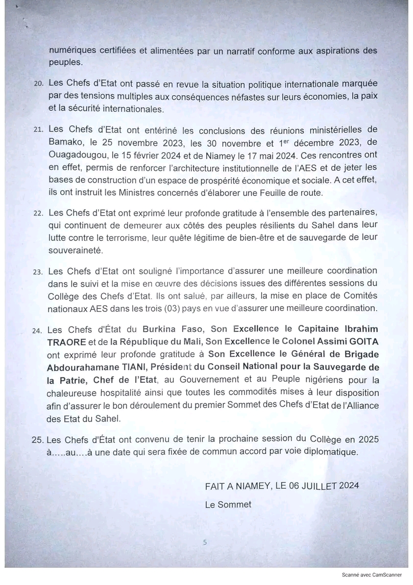 Réunis à Niamey le 06 juillet 2024, à l’invitation de Son Excellence le Général de Brigade Abdourahamane TIANI, Président du Conseil National pour la Sauvegarde de la Patrie, Chef de l’Etat de la République du Niger, pour le Premier Sommet des Chefs d’Etat de l’AES, en vue d’adopter les instruments juridiques de la Confédération AES ;