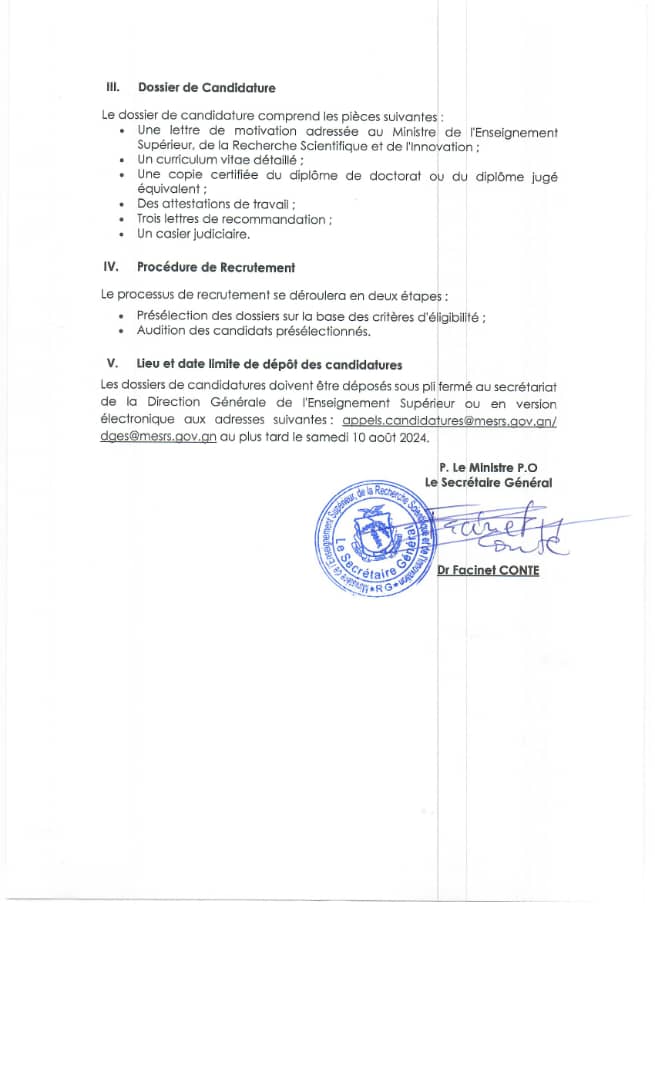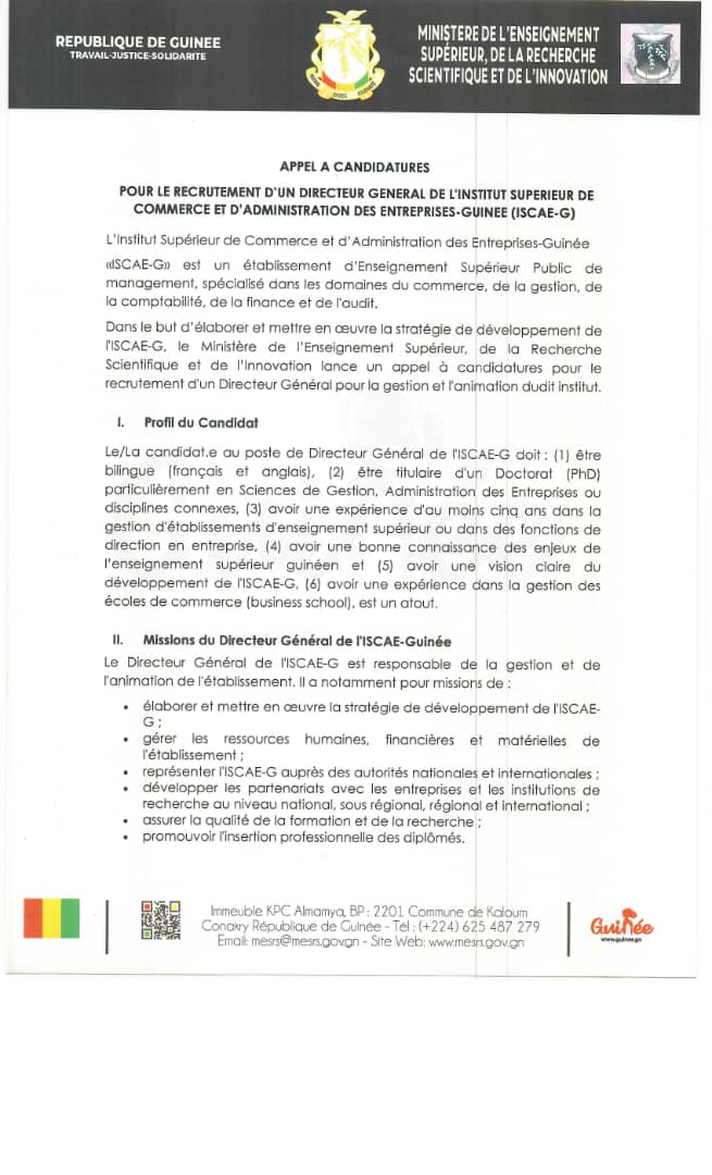 Se connecter Bienvenue ! Connectez-vous à votre compte : votre nom d'utilisateur votre mot de passe Forgot your password? Get help Récupération de mot de passe Récupérer votre mot de passe votre email Un mot de passe vous sera envoyé par email. ActualitéLes annonces Appel à candidature : le MESRSI lance le recrutement d’un Directeur général à l’ISCAE-G Publié par laguinee.info 11 juillet 2024 Share FacebookTwitterPinterestWhatsAppLinkedinEmailPrintViber À LIRE AUSSI Desserte en courant électrique : le Général Mamadi Doumbouya tape du poing sur la table ! (Confidences) 4 juillet 2024 Filets fatigués, poissons rares: les pêcheurs de Koba dans l’impasse ! 20 avril 2024 Koba: immersion dans l’univers des producteurs artisanaux du sel 19 avril 2024 Le gombo, le trésor vert de la sous-préfecture de Koba ! 18 avril 2024 laguinee.infohttps://laguinee.info Share FacebookTwitterPinterestWhatsAppLinkedinEmailPrintViber Article précédentAffaire Damaro à la Crief : les plaidoiries et réquisitions prévues ce vendredi 12 juilletArticle suivantOuganda : Edward Awebwa, un tiktokeur de 24 ans condamné à 6 ans de prison pour avoir insulté le président Museveni - Advertisement - ECHO DE NOS RÉGIONS Retour de mission mouvementé : frayeur pour Elhadj Fodé Madjaye Magassouba après un accident à Tapiyoka 23 février 2026 Kindia : un incendie ravage plusieurs hectares d’ananas, un exploitant agricole lance un appel à l’aide 22 février 2026 N’Zérékoré : une famille dévastée par un incendie en pleine saison sèche appel au secours 20 février 2026 « Quand je suis arrivé, j’ai entendu des femmes pleurer… il était dans un état vraiment critique » : témoignage sur la mort d’un... 19 février 2026 Kissidougou : le sac de ciment atteint 120 000 GNF dans les magasins 19 février 2026