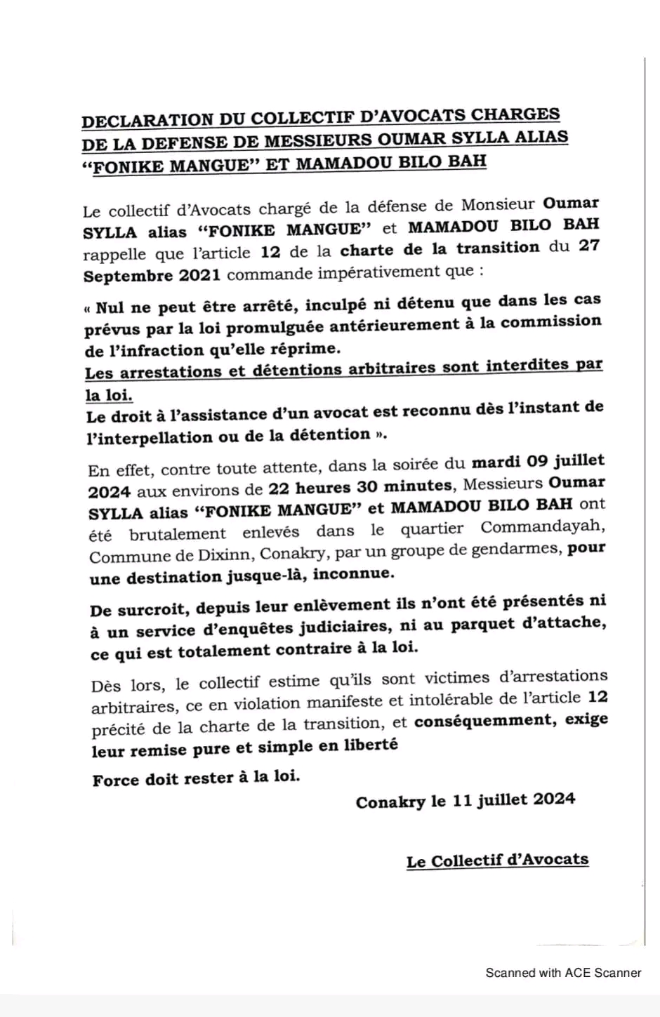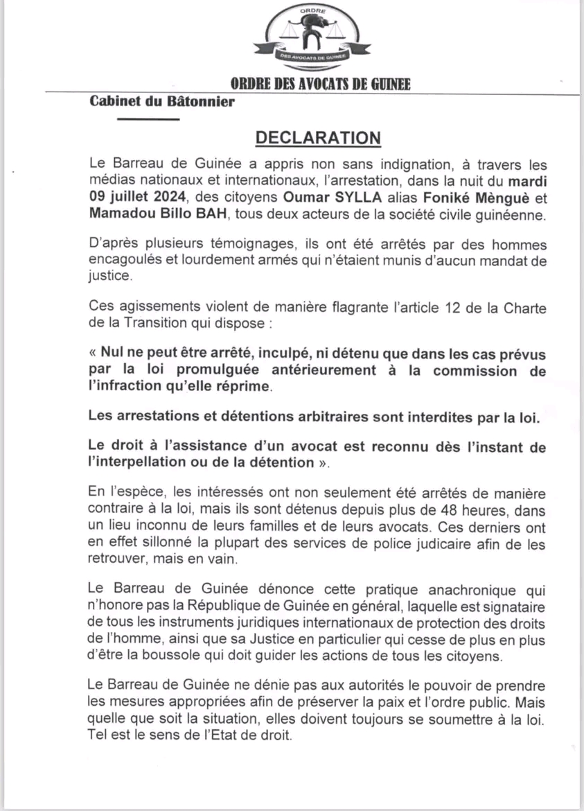 Le Barreau de Guinée brise enfin le silence sur le cas Foniké Menguè et Billo Bah ! Dans une déclaration faite ce jeudi 11 juillet 2024, le Barreau de Guinée s’est indigné de l’arrestation brutale de ces deux activistes.