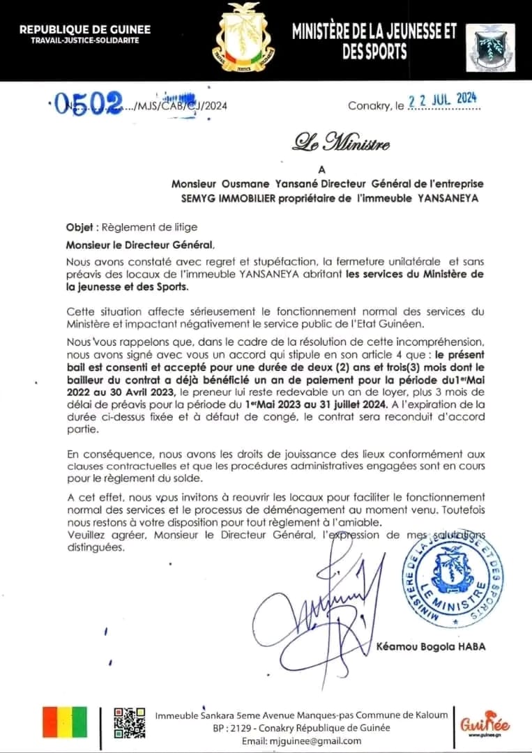 Dans une lettre adressée au bailleur, le ministre de Kéamou Bogola Haba, a demandé la réouverture des locaux pour la reprise des activités. Aussi, le ministre a opté pour un « règlement à l’amiable ».