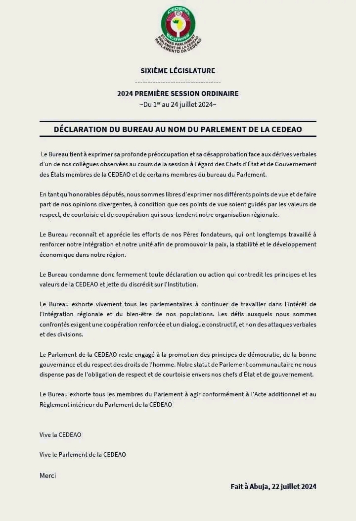 Dans un communiqué officiel, le Bureau du Parlement a déclaré : « Le Bureau tient à exprimer sa profonde préoccupation et sa désapprobation face aux dérives verbales d’un de nos collègues observées au cours de la session à l’égard des Chefs d’État et de Gouvernement des États membres de la CEDEAO et de certains membres du bureau du Parlement. » Le Bureau a souligné que de telles déclarations ne respectent pas les principes et les valeurs fondamentales de la CEDEAO.