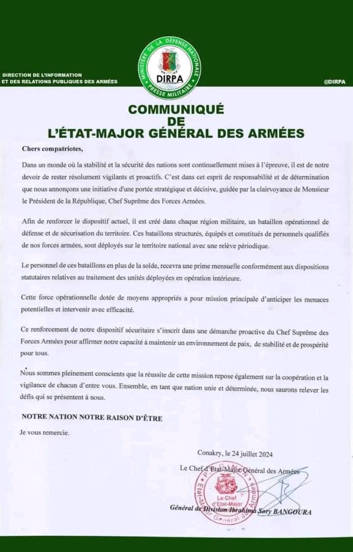 Se connecter Bienvenue ! Connectez-vous à votre compte : votre nom d'utilisateur votre mot de passe Forgot your password? Get help Récupération de mot de passe Récupérer votre mot de passe votre email Un mot de passe vous sera envoyé par email. Actualité Sécurité nationale: la DIRPA annonce la création et le déploiement des BODST dans les régions du pays Publié par laguinee.info 24 juillet 2024 Share FacebookTwitterPinterestWhatsAppLinkedinEmailPrintViber À LIRE AUSSI Desserte en courant électrique : le Général Mamadi Doumbouya tape du poing sur la table ! (Confidences) 4 juillet 2024 Filets fatigués, poissons rares: les pêcheurs de Koba dans l’impasse ! 20 avril 2024 Koba: immersion dans l’univers des producteurs artisanaux du sel 19 avril 2024 Le gombo, le trésor vert de la sous-préfecture de Koba ! 18 avril 2024 laguinee.infohttps://laguinee.info Share FacebookTwitterPinterestWhatsAppLinkedinEmailPrintViber Article précédentSécurité: le Burkina Faso renforce ses effectifs militaires avec le recrutement de 300 nouveaux VDPArticle suivantLe vent de la liberté souffle partout, sauf à Pamelap pour Dr Faya Milimouno ! - Advertisement - ECHO DE NOS RÉGIONS Retour de mission mouvementé : frayeur pour Elhadj Fodé Madjaye Magassouba après un accident à Tapiyoka 23 février 2026 Kindia : un incendie ravage plusieurs hectares d’ananas, un exploitant agricole lance un appel à l’aide 22 février 2026 N’Zérékoré : une famille dévastée par un incendie en pleine saison sèche appel au secours 20 février 2026 « Quand je suis arrivé, j’ai entendu des femmes pleurer… il était dans un état vraiment critique » : témoignage sur la mort d’un... 19 février 2026 Kissidougou : le sac de ciment atteint 120 000 GNF dans les magasins 19 février 2026