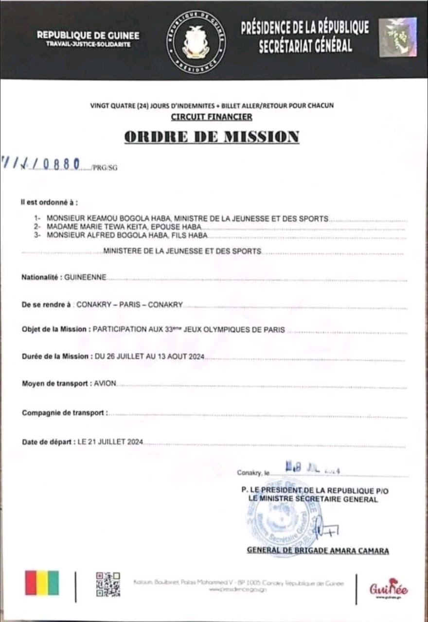 Depuis quelques heures, une image circule largement sur les réseaux sociaux montrant un ordre de mission signé par le général Amara Camara, ministre secrétaire général de la présidence de la République. Ce document autorise Kéanmou Bogola Haba, ministre de la Jeunesse et des Sports, son épouse Marie Tewa Keïta, et leur enfant Alfred Bogola Haba, à se rendre aux Jeux Olympiques de Paris. La mission inclut « vingt-quatre (24) jours d’indemnités pour + billet aller/retour pour chacun » pour un montant dépassant 275 millions de francs guinéens.