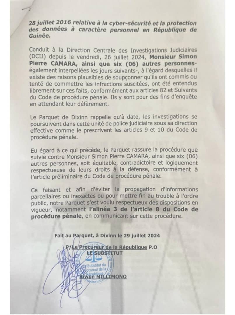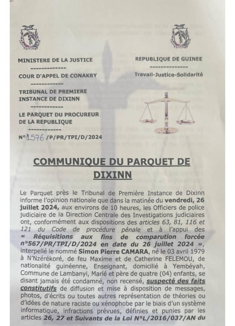 Le parquet de Dixinn a confirmé l’arrestation de Simon Pierre Camara le 26 juillet 2024, dans le cadre d’une enquête sur la diffusion de messages à caractère raciste. Camara, ainsi que six autres personnes, sont suspectés de violations liées à la cybersécurité. Les investigations se poursuivent sous la supervision du Parquet.