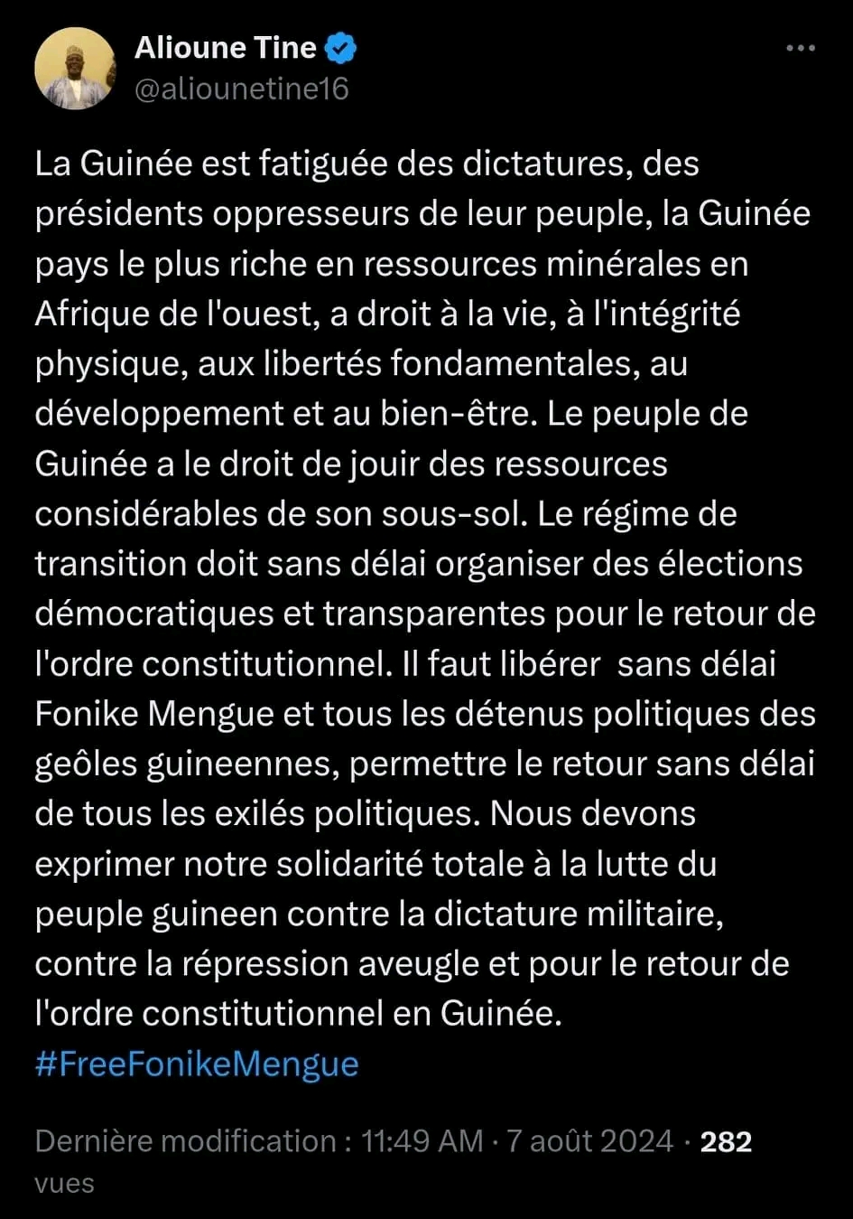 M. Tine a ajouté : « Il faut libérer sans délai Foniké Menguè et tous les détenus politiques des geôles guinéennes, permettre le retour sans délai de tous les exilés politiques. Nous devons exprimer notre solidarité totale à la lutte du peuple guinéen contre la dictature militaire, contre la répression aveugle et pour le retour de l’ordre constitutionnel en Guinée. #FreeFonikeMengue »
